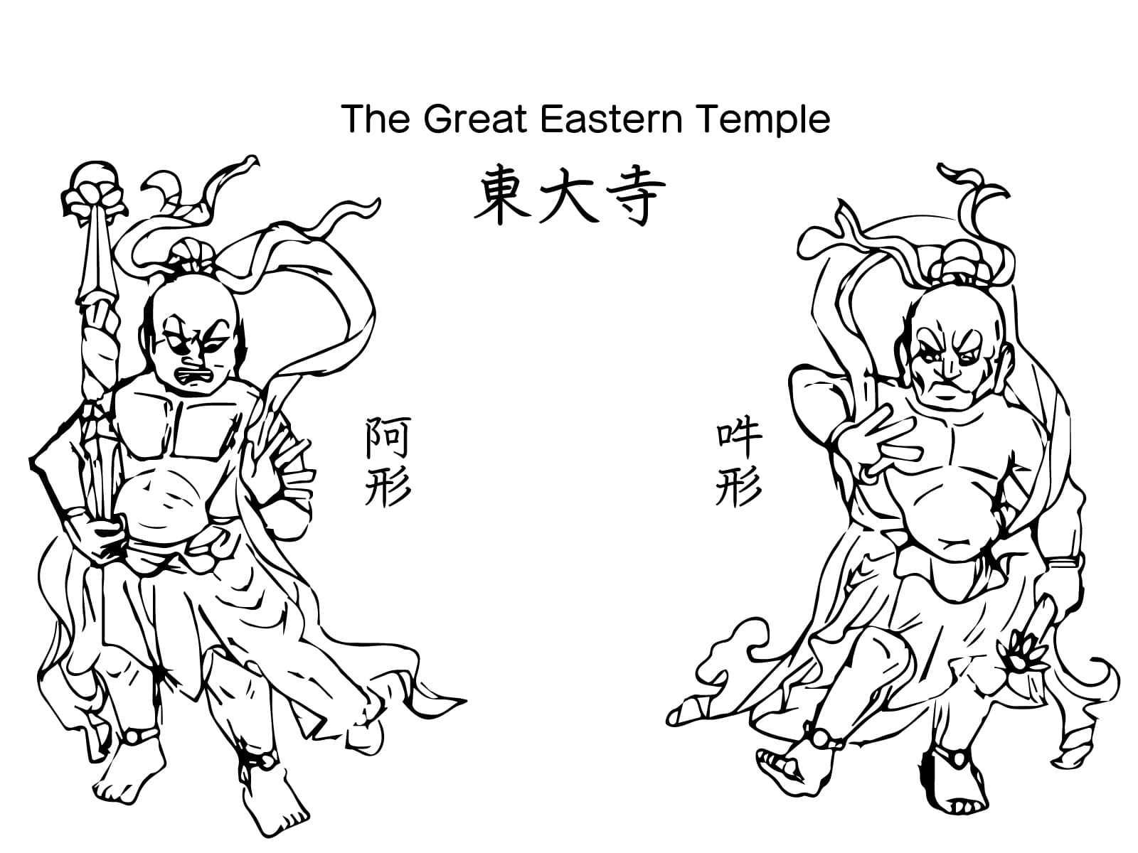 お寺の入り口(仁王門)で仏法や聖域を守る一対の守護神です。正式には「金剛力士」と呼びます。向かって右側が口を開いた「阿形(あぎょう)」、左側が口を結んだ「吽形(うんぎょう)」で、宇宙の始まりと終わりを表す「阿吽の呼吸」の由来にもなりました。隆起した筋肉と力強い表情が最大の特徴です。