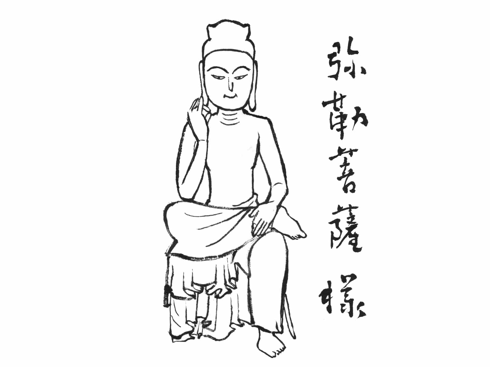 お釈迦さまの次に悟りを開き、遥か未来に人々を救うと約束された「未来の仏」です。現在は修行中の身であり、右足を膝に乗せ、指を頬に当てて「どうやって人々を救おうか」と思案するポーズ(半跏思惟像)が有名です。