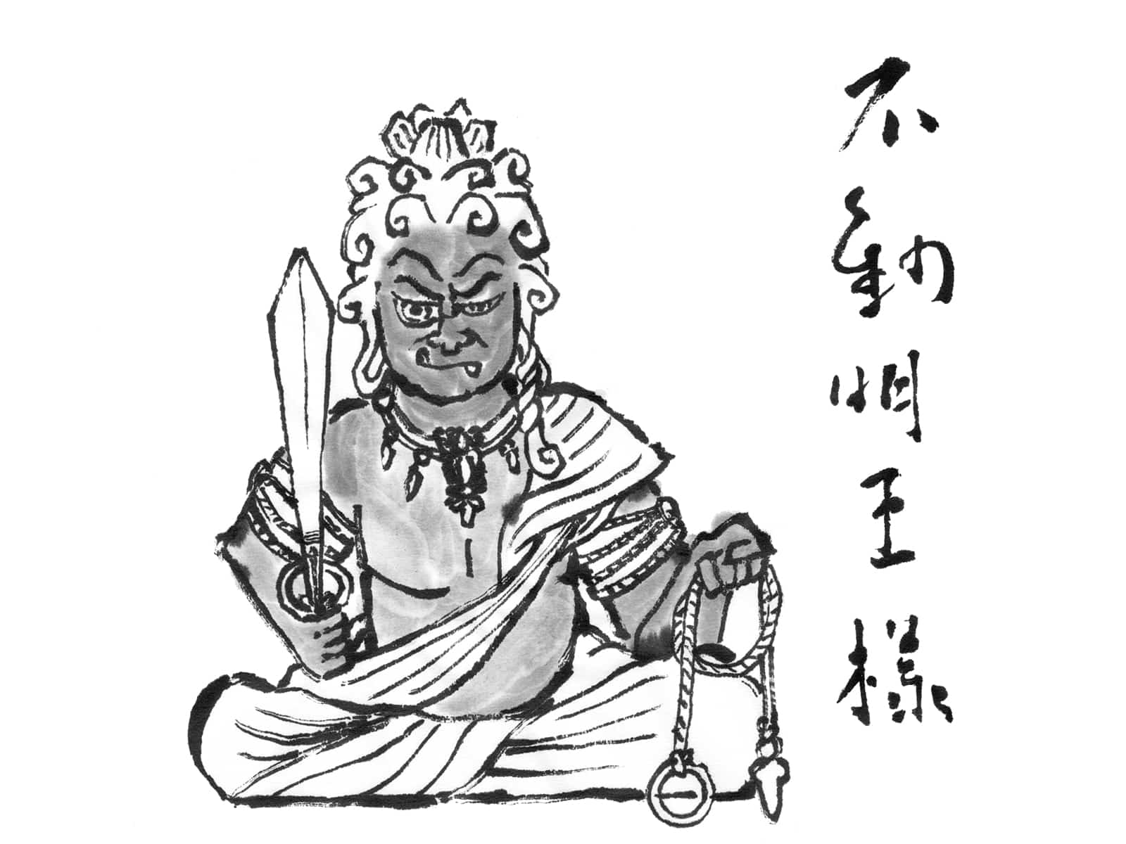 大日如来の化身。煩悩を断ち切る剣と、悪人を縛る縄を持ち、追いかけて救ってくれます。