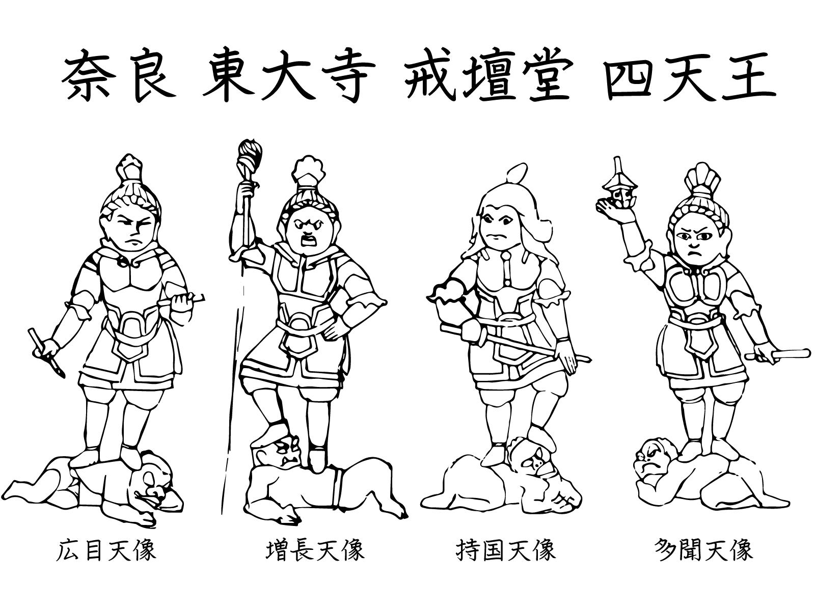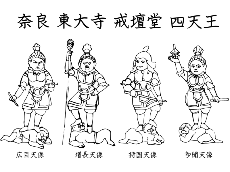 世界の中心にある「須弥山(しゅみせん)」の四方を守る、如来のガードマンのような武神たち。東の持国天、南の増長天、西の広目天、北の多聞天(毘沙門天)で構成され、それぞれ足元で「邪鬼(じゃき)」という悪鬼を踏みつけているのが特徴。甲冑を身にまとい、厳しい表情で仏教の聖域を監視しています。
