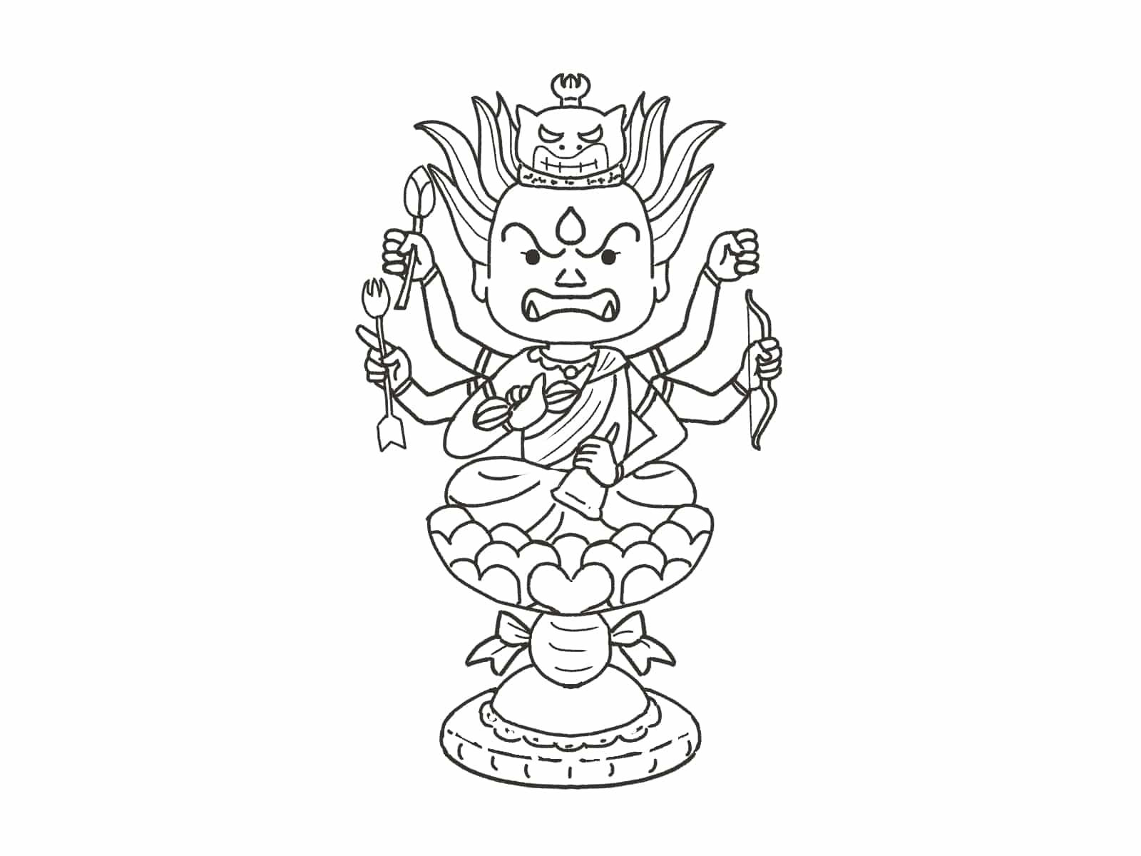 言葉で言ってもわからない強情な衆生を、恐ろしい姿で叱りつけ、無理やりでも正しい道へ導く、如来の化身(変化した姿)です。大日如来の命令に忠実に従います。
