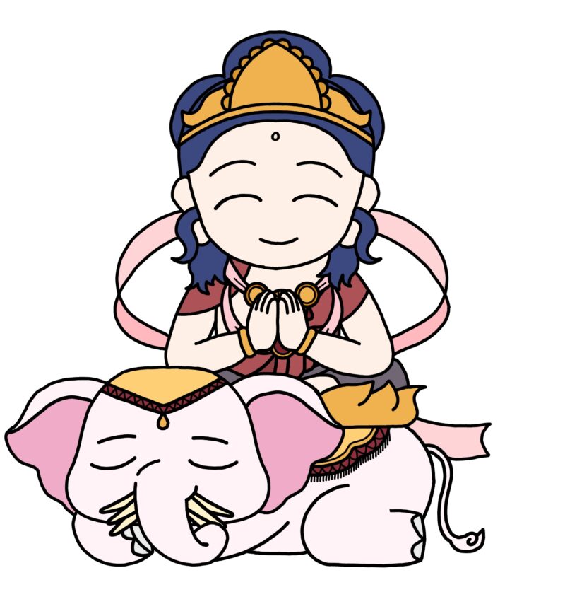 普賢菩薩歩みは遅くても力強く進む象は、修行をコツコツ続ける「実践・慈悲」を表します。6本の牙を持つ白い象に乗っています。