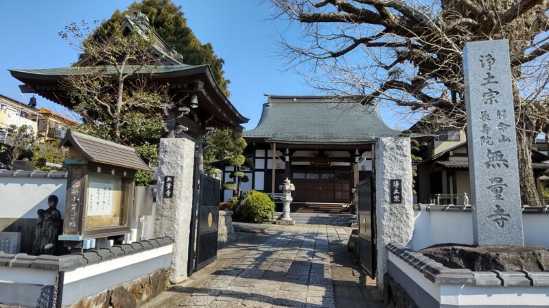 鎌倉安養院の深誉呑霊上人が開創と伝えられています。ご本尊の阿弥陀如来像は、1702年に鎌倉の仏師、後藤左近によって作られたと伝えられています。浄土宗の寺院名に多い「無量」は、阿弥陀如来の別名である「無量寿仏」(無限の寿命を持つ仏)や「無量光仏」(無限の光明を持つ仏)に由来、極楽浄土の教えを象徴しています。
