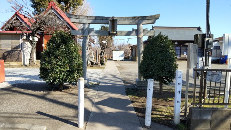 すこし先には、「三柱神社」です。その名の通り「三つの神社」が合祀されたことで成立した、比較的新しい神社ですが、祀られている神様は古くからこの地域を見守ってきた鎮守様たち。