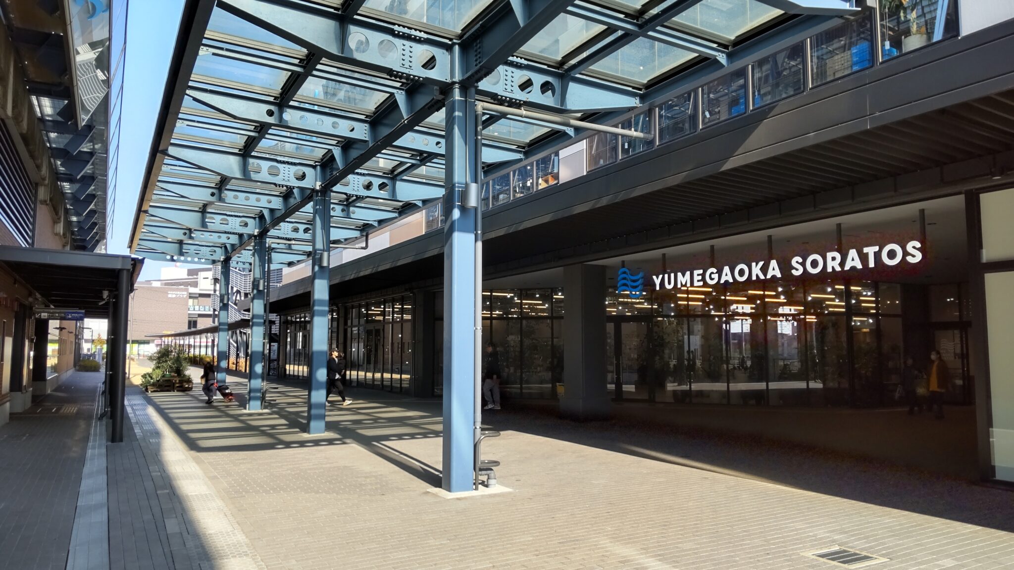 あとひと踏ん張り、相鉄いずみ野線「ゆめが丘」の駅が見えてきました。初めて訪れる駅、鉄骨とガラスを多用した曲面的なデザインが特徴の近未来的な雰囲気です。「関東の駅百選」にも選ばれているそうです。