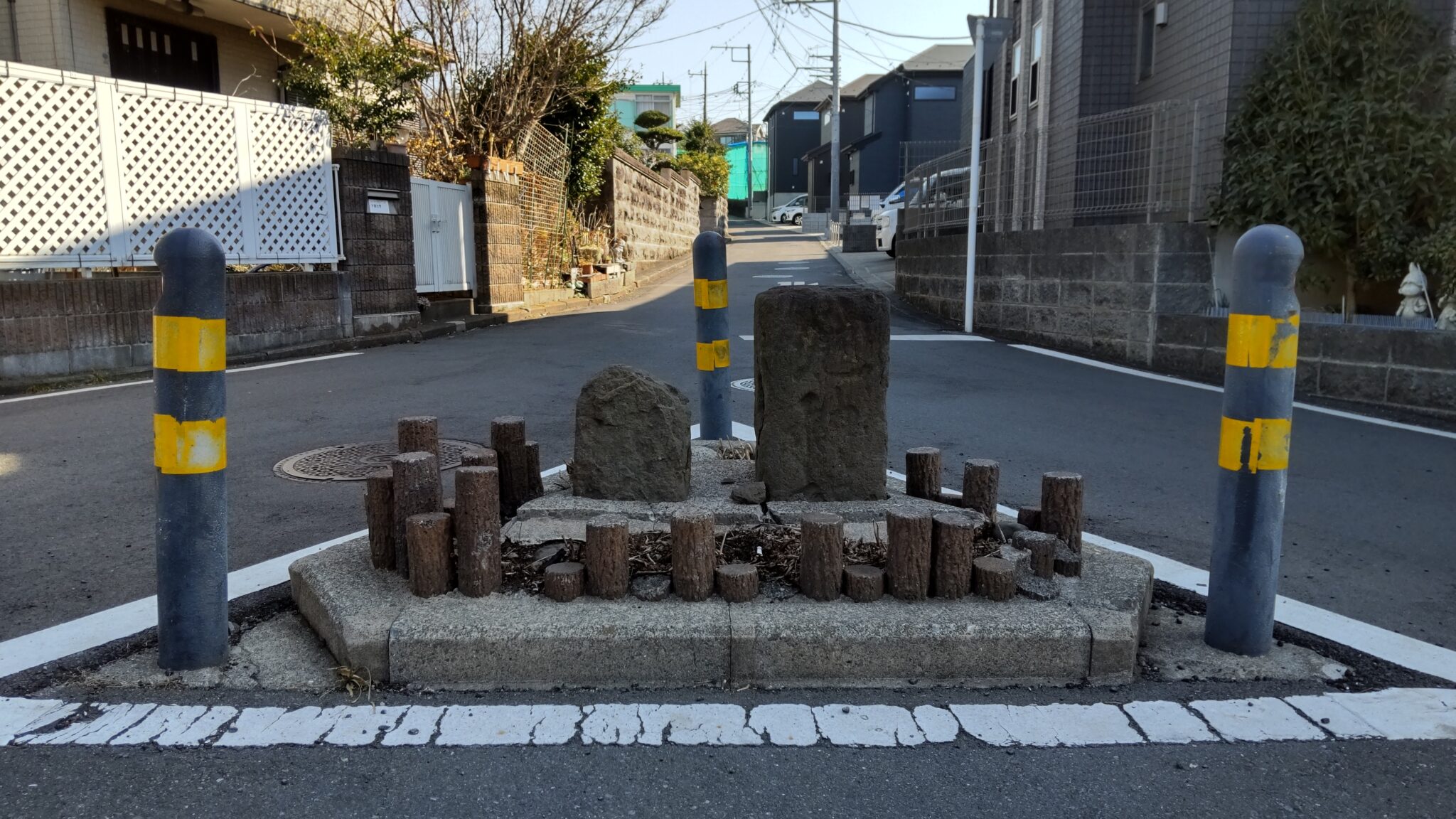 引き続き相鉄線沿いに進み、境川に架かる鹿島橋を超えて右折。先の三叉路のど真ん中に石塔が見えてきました。交通の妨げと思われる危ない状況の石塔は「地神塔」でした。ここまでして、守らなければいけないものもある!地域住民の動かせない気持ちも分かります、利便性が全てではありませんよね。