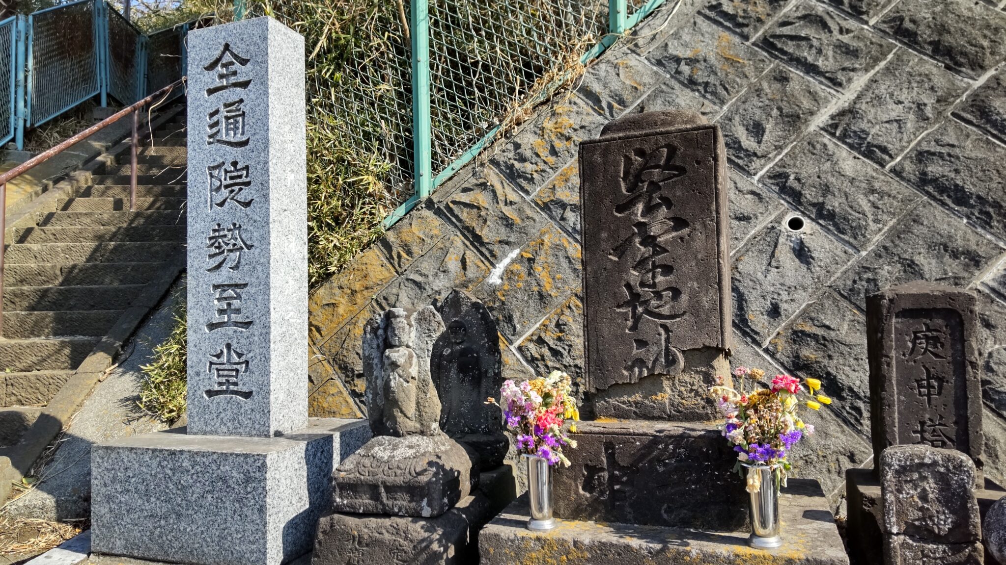 中原街道を横断し住宅街を進み相沢川を過ぎると現れる大きな道路は環状四号線。歩道橋を渡った先には「全通院勢至堂」の石柱と石塔群です。