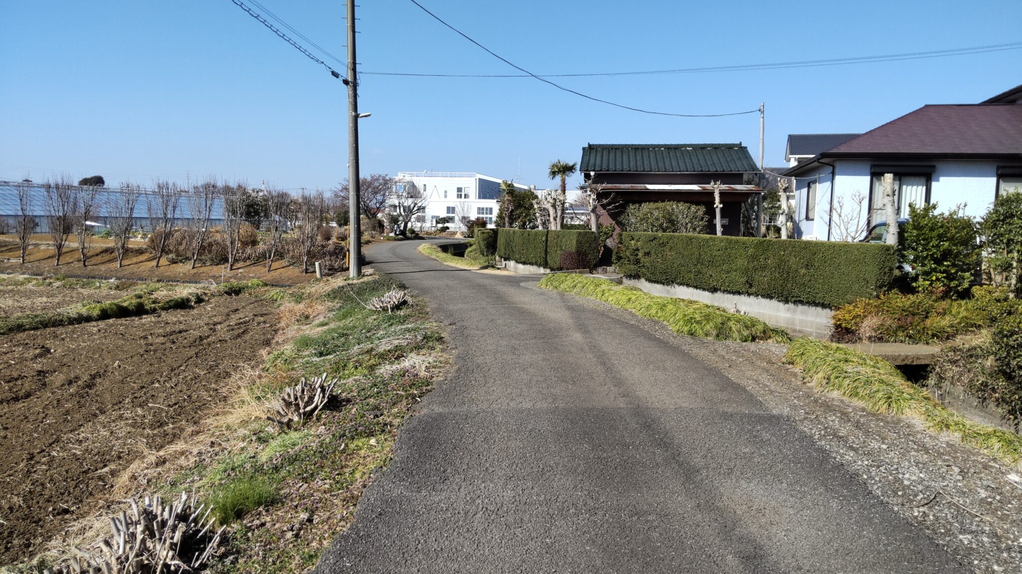 養蚕で栄えた地区だけあって、古道沿いに大きな旧家が続きます。やはり門がある家屋は趣があります、長屋門も立派。農園直売所の右手へ進むと小川と田んぼの中をいい感じの古道が残っています。