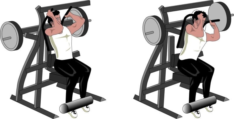 シートの高さは、グリップを握った時に肩と同じくらいの高さになるように設定します。背中をシートに密着させ、胸を張って押しましょう。