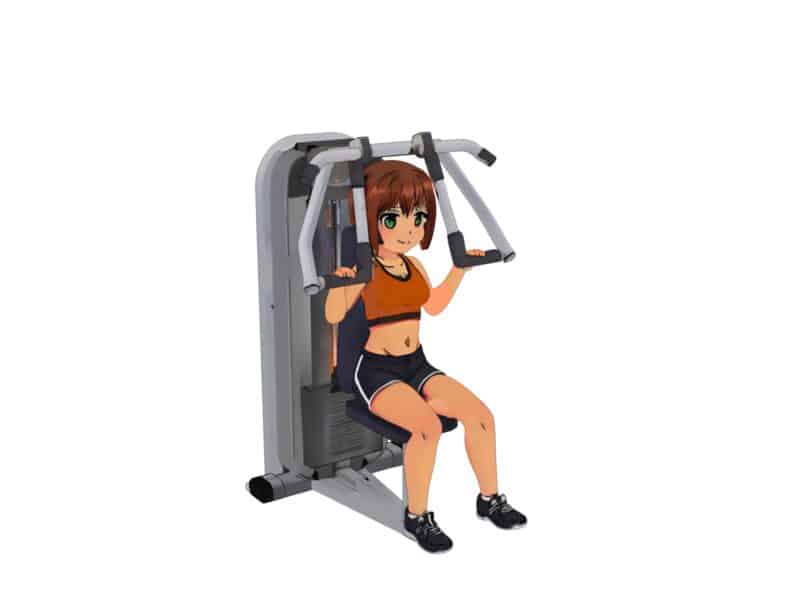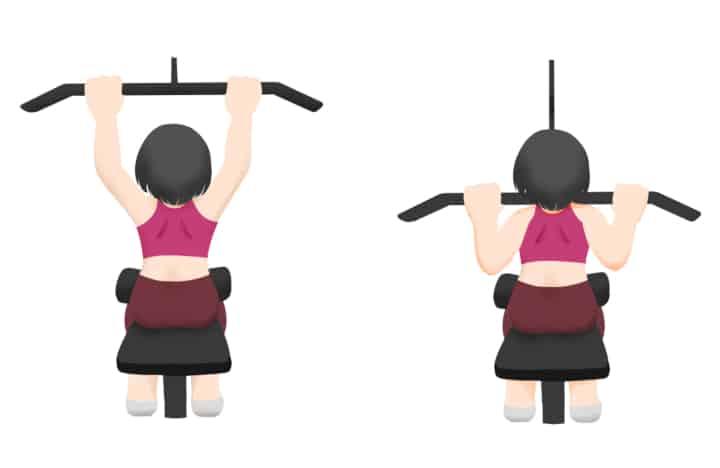 太ももをパッドでしっかり固定し、やや後ろに体を傾けてバーを鎖骨めがけて引き下ろします。背中の筋肉が使われていることを意識しましょう。