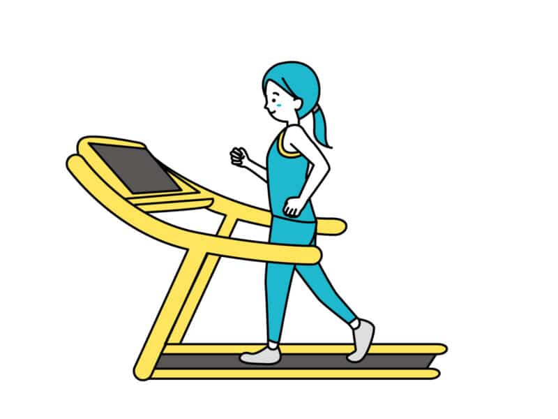 最初はウォーキングから。速度は 5km~6kmから始め、傾斜(インクライン)を少しつけると効果的です。手すりを強く握りすぎないようにしましょう。
