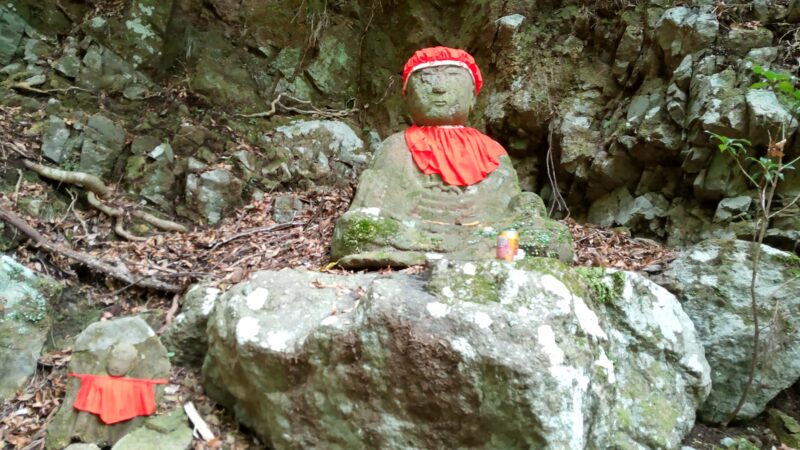参拝を済ませて左方向の女坂へ進みます。空気も澄んでいて、水の流れる音も心地よく快適な山道歩きが楽しめます、左右に点在する古いお地蔵さんを見ながら進みます。
