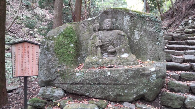 登りの勾配がきつくなってきました。右に見えてきた仏さま、最後の不思議その七、「眼形石(めがたいし)」です。案内板には、人の眼の形をしたこの石に、手を触れてお祈りすれば、不思議に眼の病が治ると言い伝えられている。とあります。最近すっかり視力が衰えてきた私。どれ?どれ?よくわからないので、いくつか石に触れておきました。老眼鏡の数字が増えませんように…