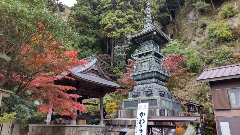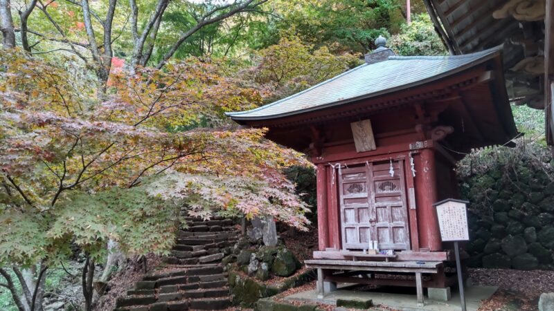 お隣は、元は二重滝にあり1641年に再建された「龍神堂(八大堂)」、倶利伽羅堂です。朱塗りのお堂には紅葉が似合います。奈良時代に大山寺別当の良辯僧正が大山龍神を感得、以後八大龍王と呼び大山の守護神にして雨乞いの本尊なりとあります。雨乞いのご本尊、八大龍王が祀られているありたいお堂ということですね。
