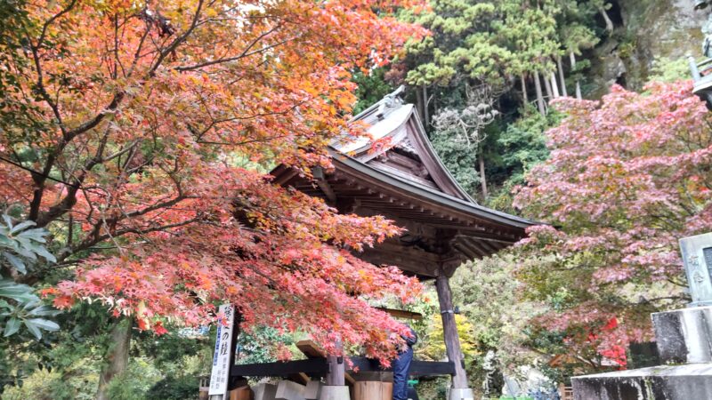 「本堂」はさすがに風格があり、彫刻も見事で必見です。今にも飛び出しそうな勢いのある龍、滝に打たれるお坊さんの表情もすばらしい。境内はきれいな水があふれ出る「手水鉢」、大師堂、過去には家光公が奉納した梵鐘があった「鐘楼」、1795年建立の「宝篋印塔」、倶利伽羅の滝があります。お堂の前から見るもみじと湘南方面は絶景。