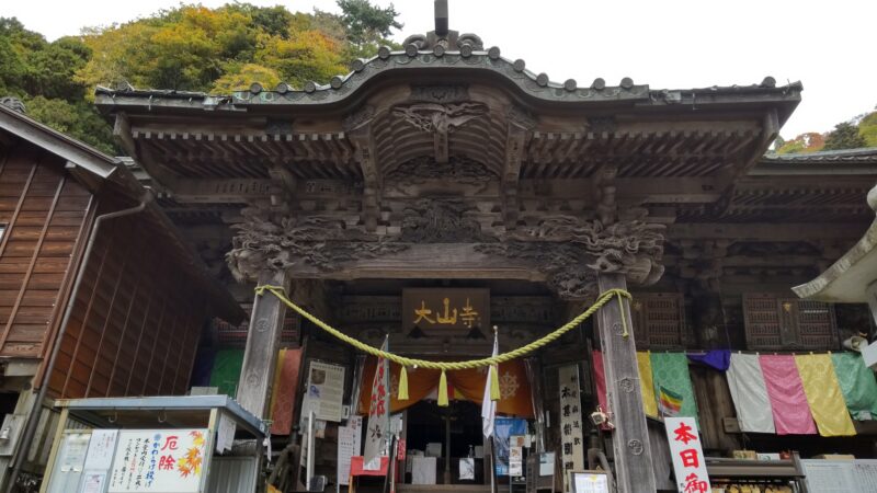 まもなく大山寺ですが、その手前に山中の厳しい自然に耐え抜いてきた感じの佇まいの寺院がありました。「宝珠山来迎院」と書かれているようで、「前不動明王」の扁額がいい感じに劣化して自然と一体化しています。
