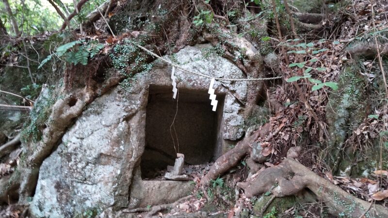 すぐ先の左手山肌に見えてきた案内板、大きな岩に穴が開いています。ここが不思議その六「潮音洞(ちょうおんどう)」。案内には、洞に近づいて心を鎮め耳を澄ませると遠い潮騒が聞こえるという。この洞の中にどのような神秘が隠されているのであろうか?とあります。