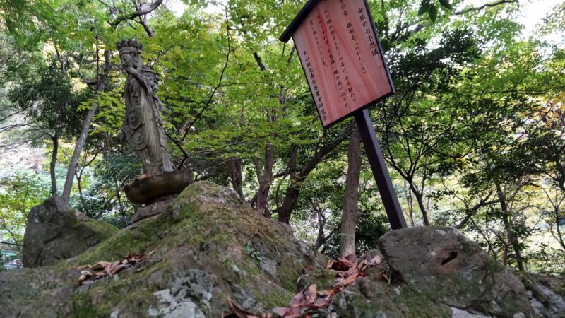 森も深くなり山の木々も色づき始めています。樹木が鬱蒼と茂るなか現れたのが「逆さ菩提樹」。女坂の不思議その四です。案内板には、上が太くて下が細く逆さに生えたように見えることから逆さ菩提樹という。現在は二代目である。とありました。