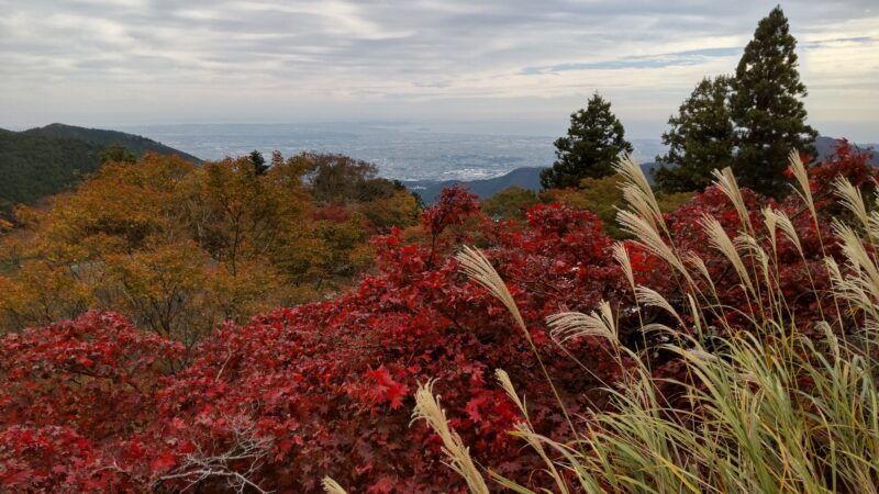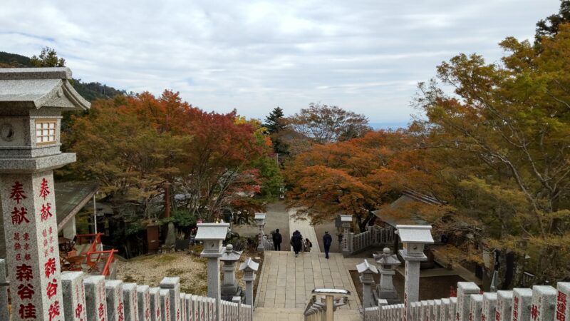 参道の階段脇のもみじは色づき始めており赤や黄色の紅葉景色がいい感じになってきました。前回と比べると明らかに葉っぱの色が違いますね。神社前の展望デッキからは江ノ島方面が紅葉パノラマ状態でした。