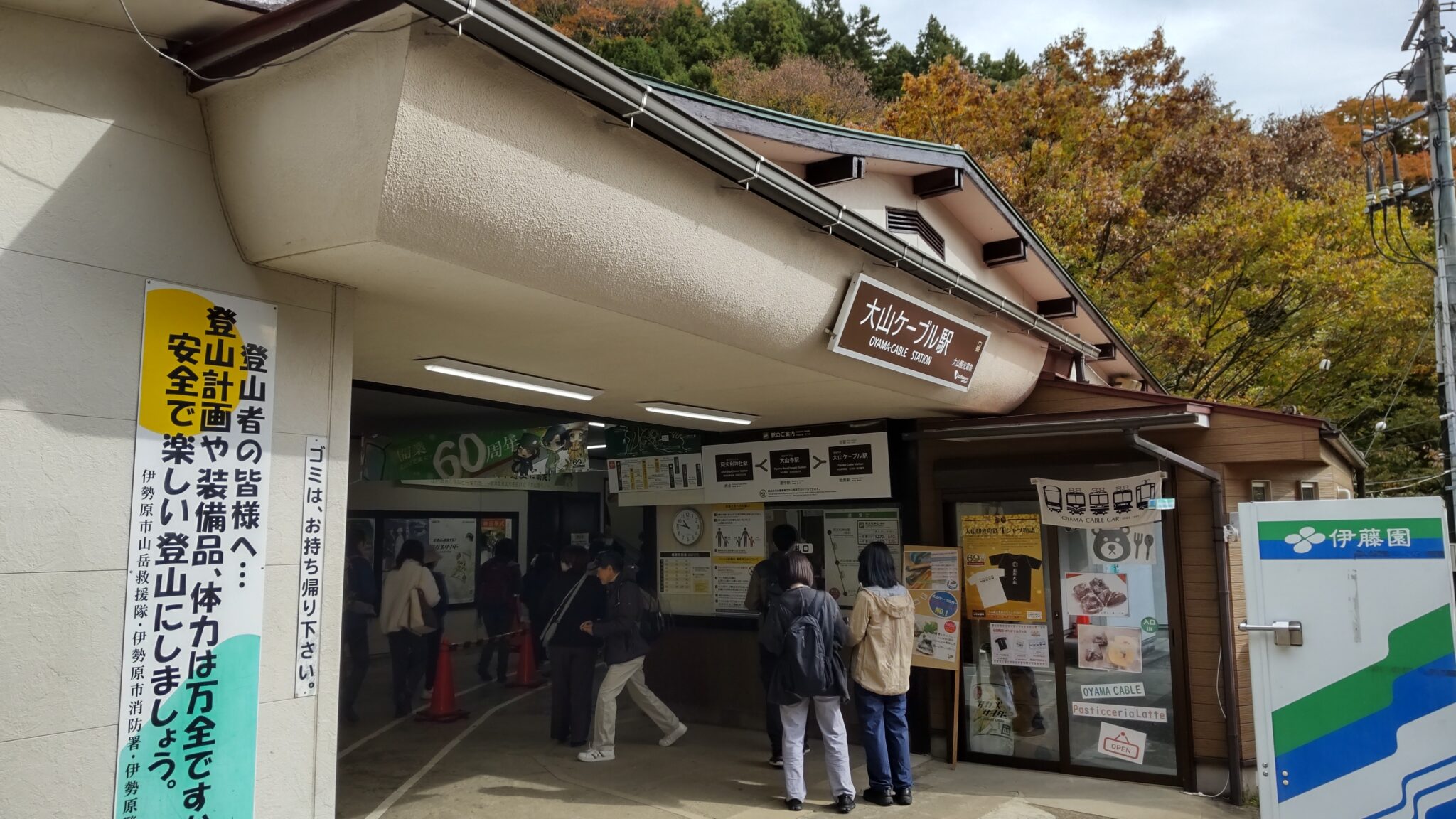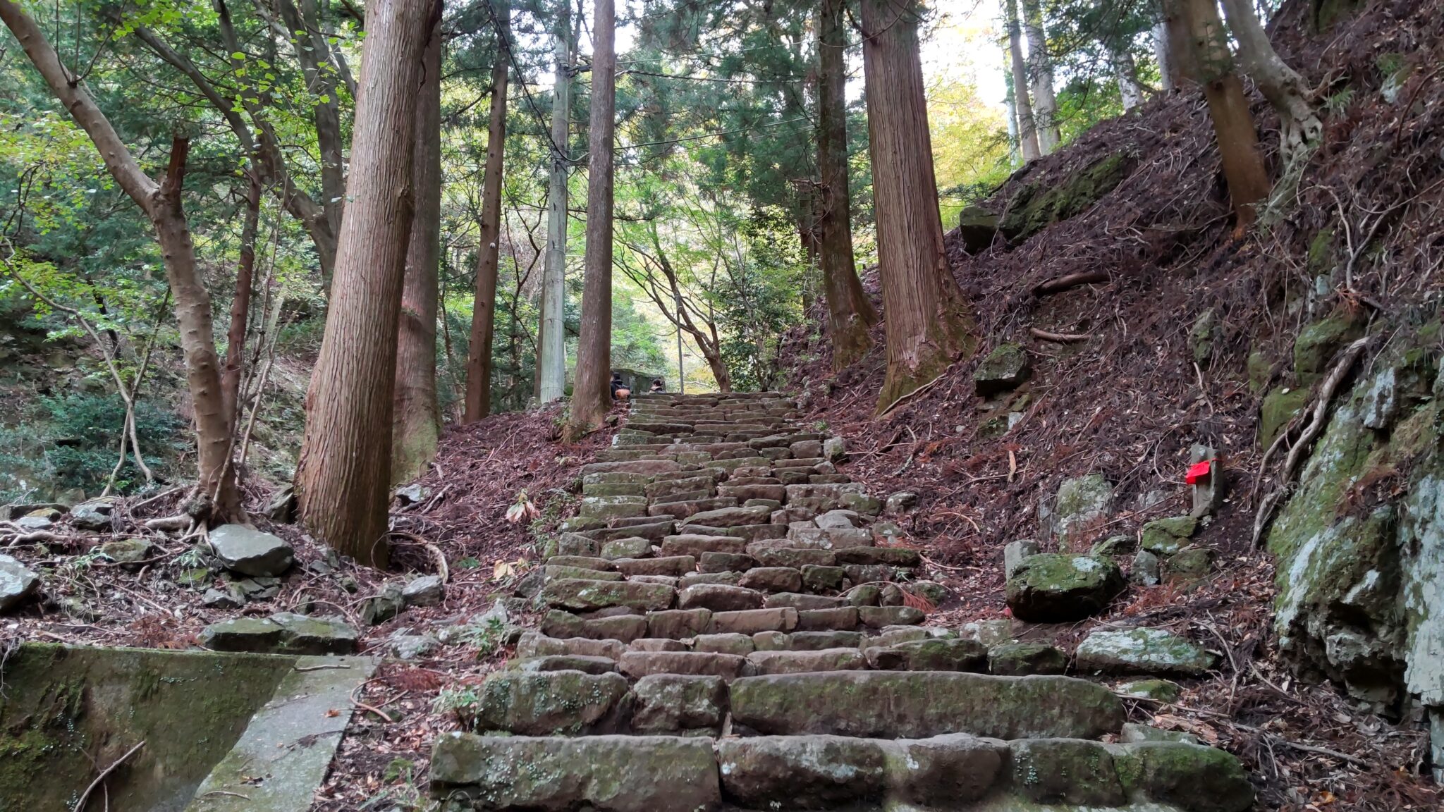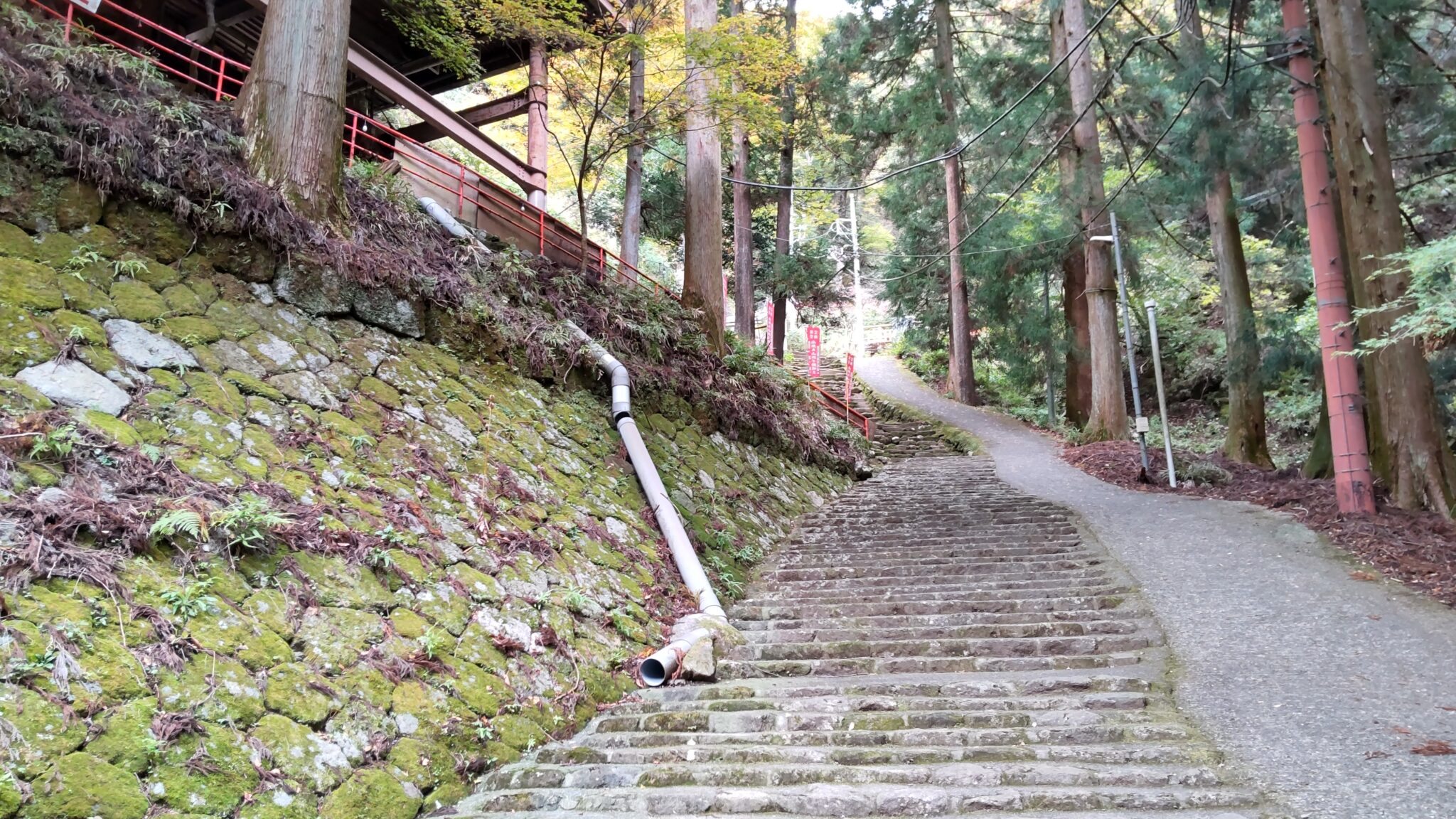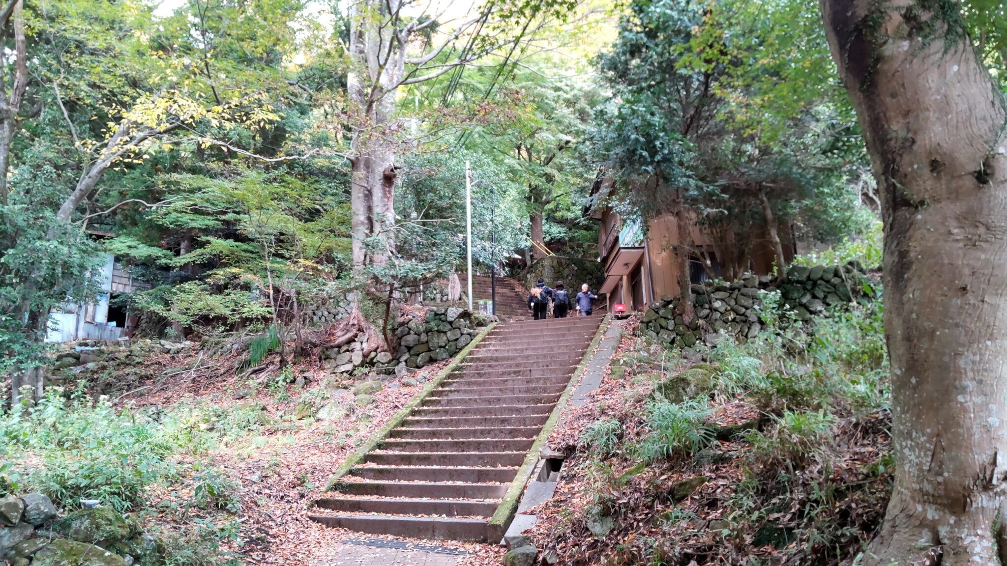 大山ケーブ駅に到着、平日ですが外国人観光客の方も多く賑わっています。今日は乗り場ではなく、駅の左手に進み登山口に向かいます。山奥に続く長い階段からのスタートとなります。