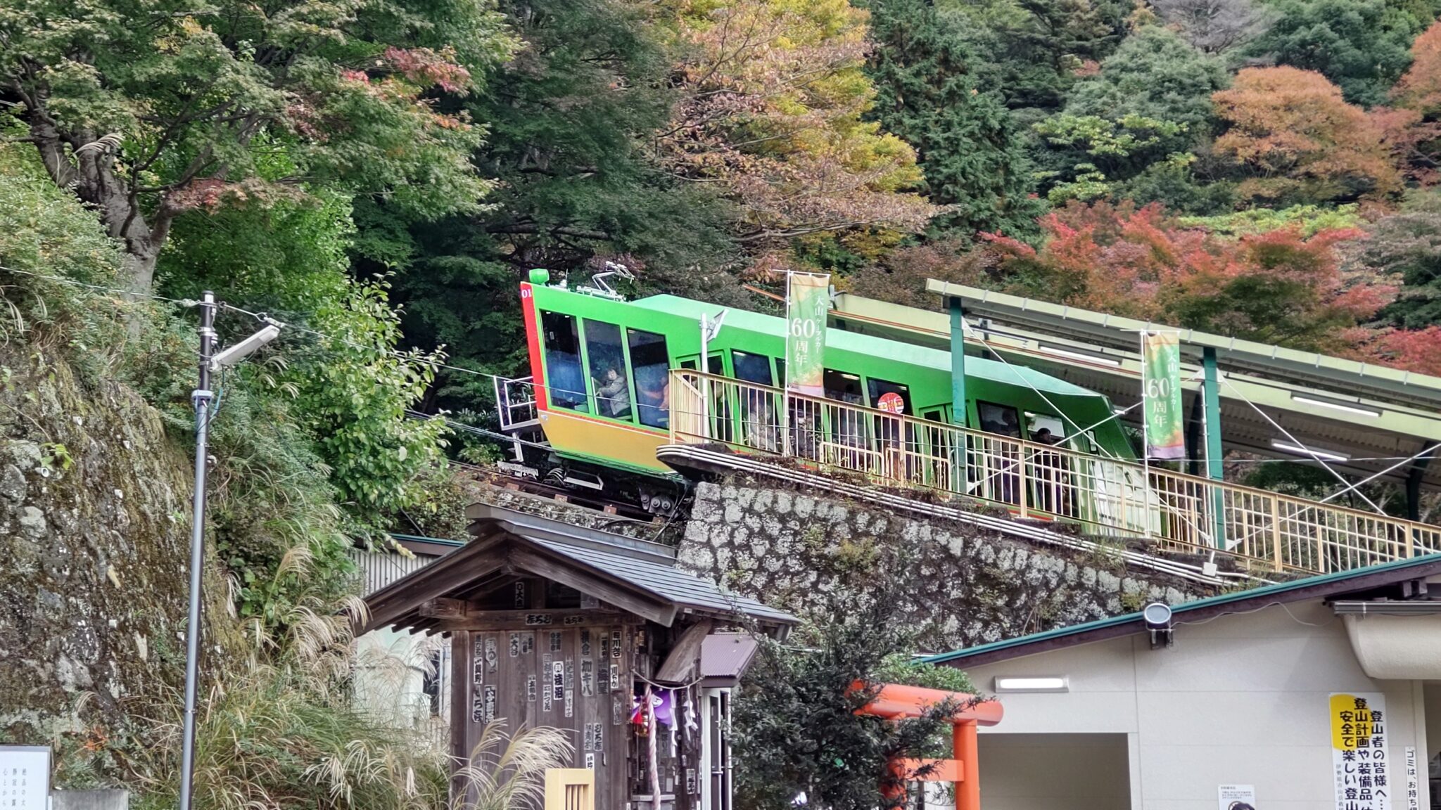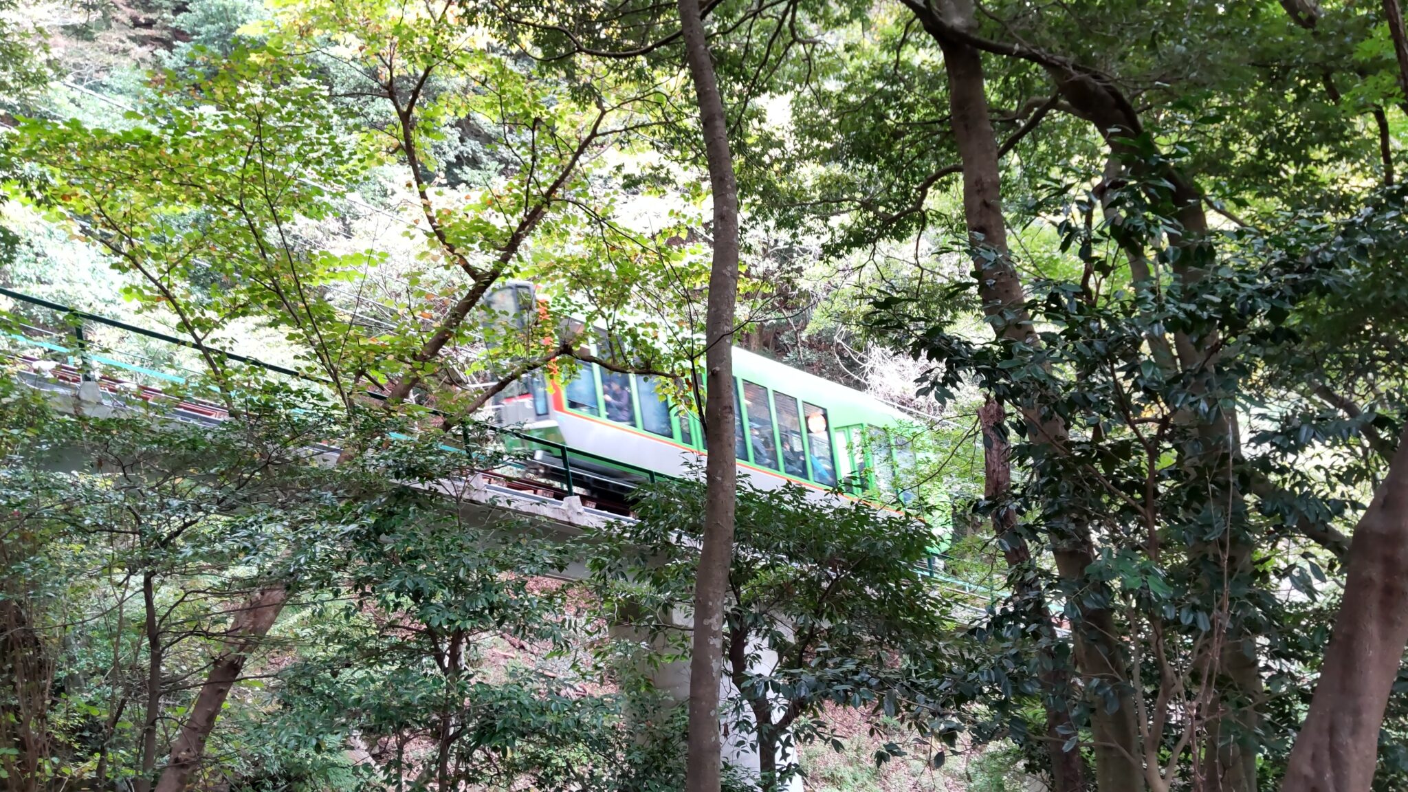 ちょうど横をケーブルカーが通り過ぎます。思っていたよりスピードが速くてビックリ、山の中を颯爽と走る姿カッコいいですね。
