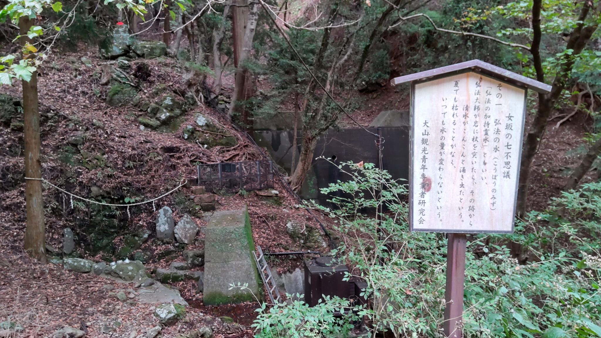 早速一つ目の七不思議、「弘法の水」が登場。案内板には、「弘法の加持霊水」ともいい、弘法大師が岩に杖を突いたら、その跡から清水がこんこんと湧き出たという。夏でも枯れることがなく、いつでも水の量が変わらないという。との案内です。