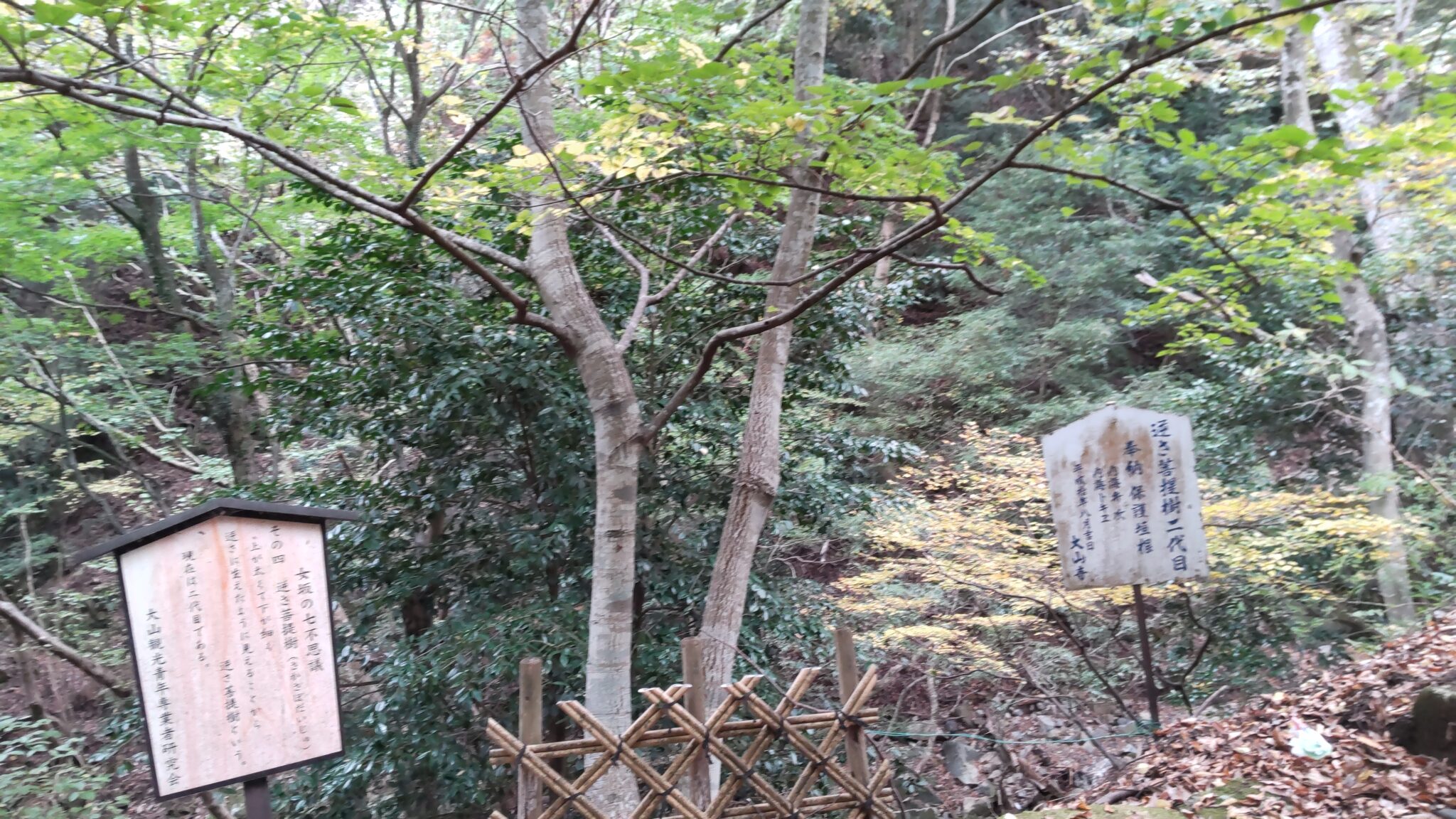 森も深くなり山の木々も色づき始めています。樹木が鬱蒼と茂るなか現れたのが「逆さ菩提樹」。女坂の不思議その四です。案内板には、上が太くて下が細く逆さに生えたように見えることから逆さ菩提樹という。現在は二代目である。とありました。