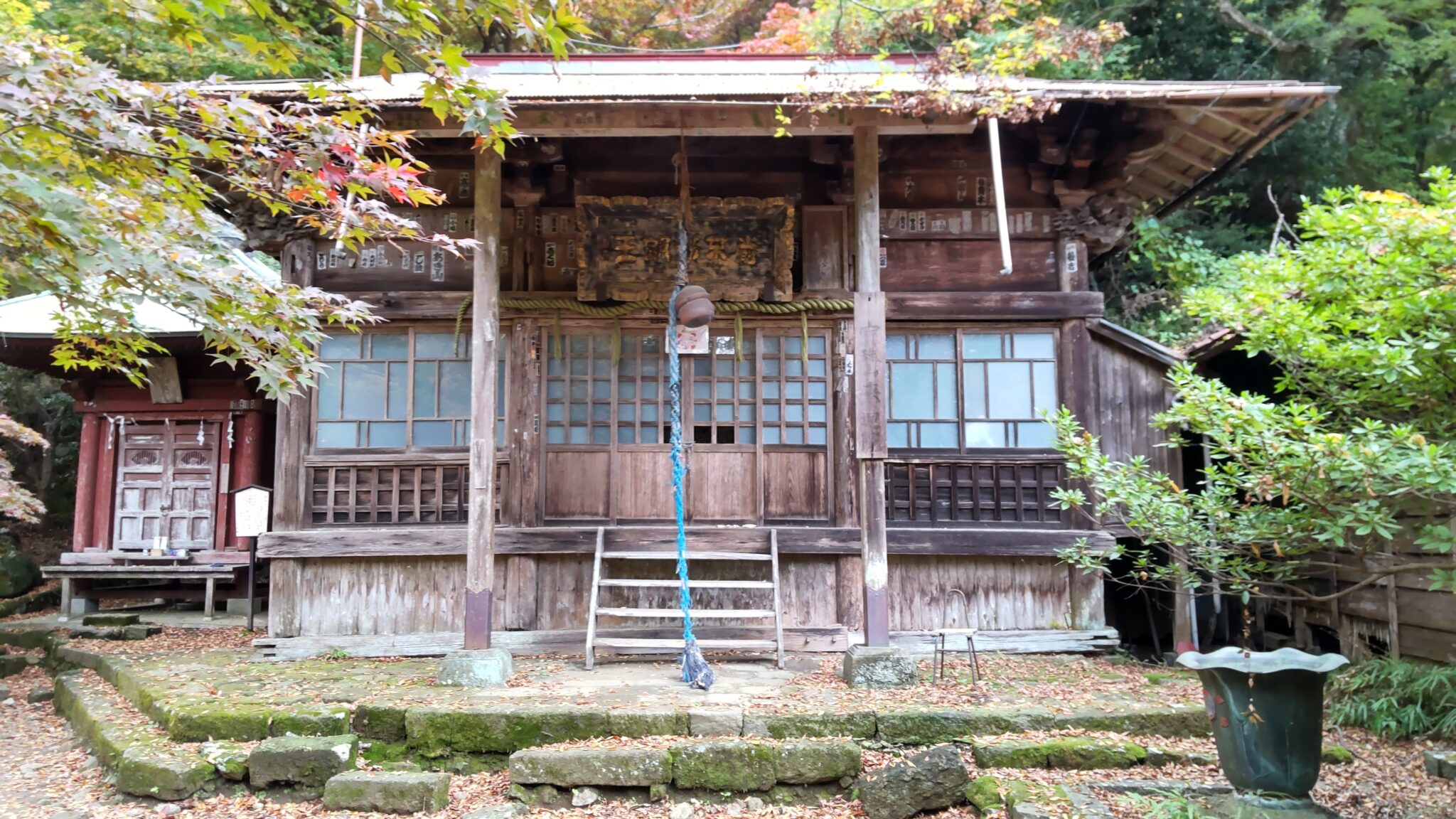 まもなく大山寺ですが、その手前に山中の厳しい自然に耐え抜いてきた感じの佇まいの寺院がありました。「宝珠山来迎院」と書かれているようで、「前不動明王」の扁額がいい感じに劣化して自然と一体化しています。