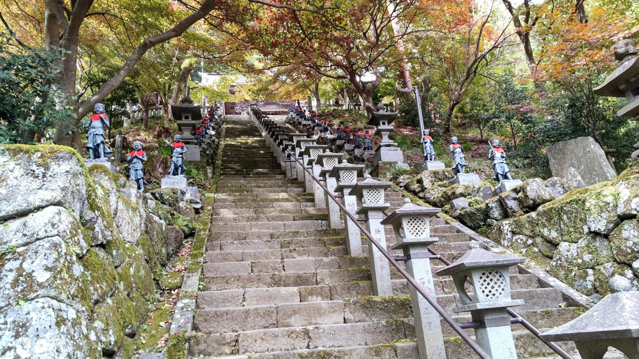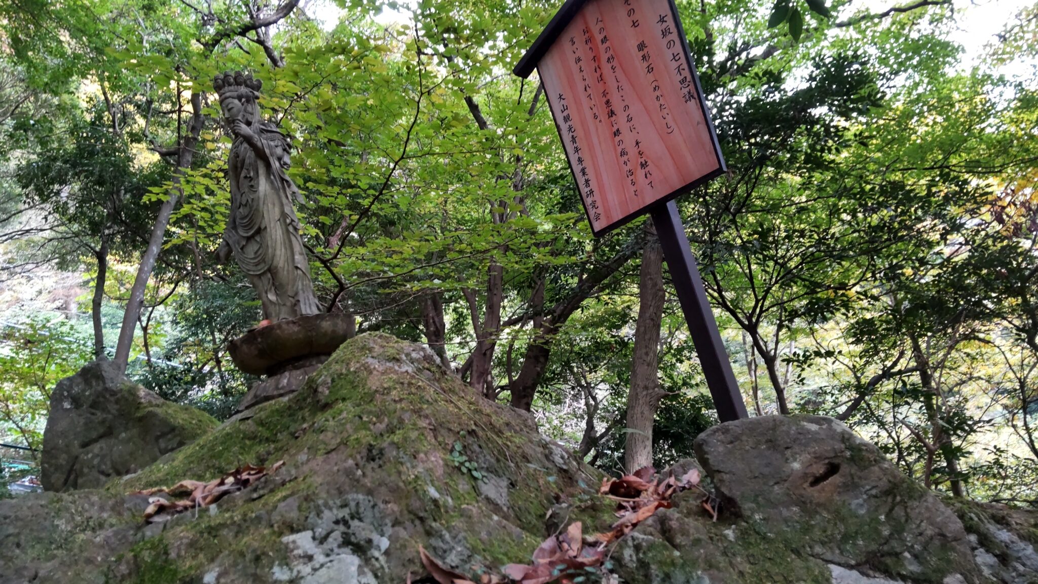 参拝を済ませて左方向の女坂へ進みます。空気も澄んでいて、水の流れる音も心地よく快適な山道歩きが楽しめます、左右に点在する古いお地蔵さんを見ながら進みます。