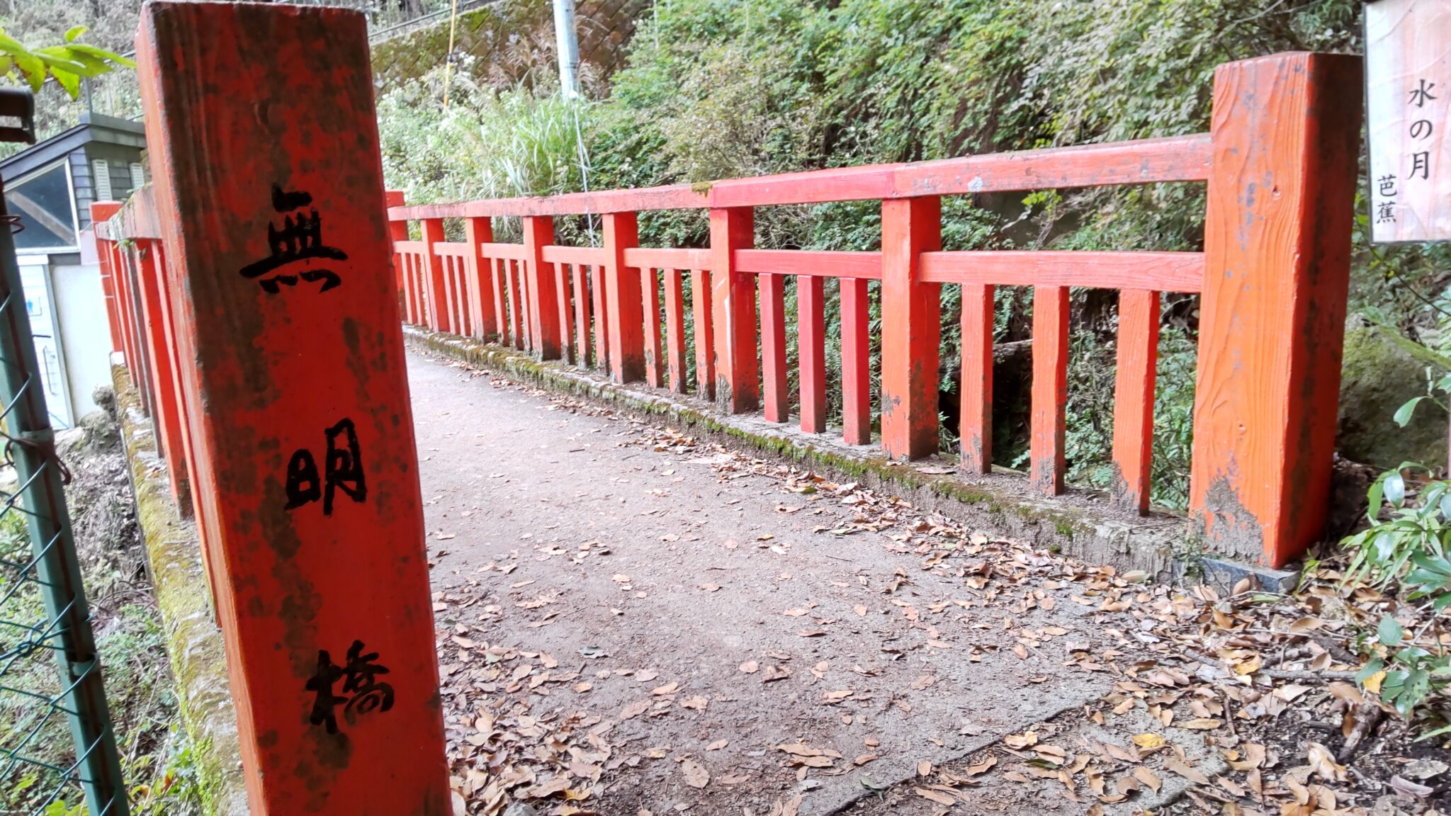 本堂を後に山道を進み朱色の橋を渡ります。この橋が不思議その五「無明橋」。案内板には、話をしながら通ると橋から下に落ちたり、忘れ物や落し物をしたり、悪い事が起きたりするという。とありました。