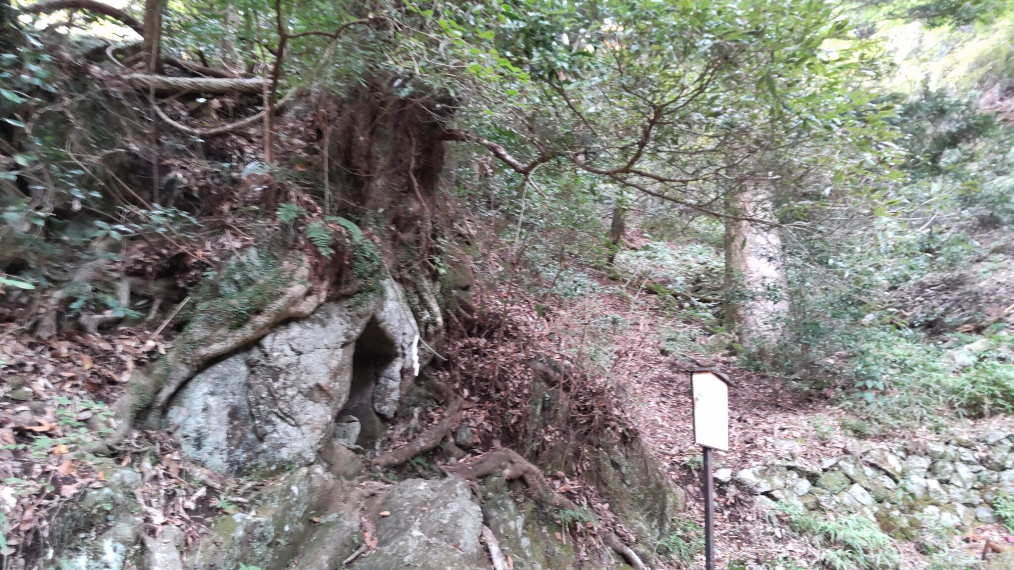 すぐ先の左手山肌に見えてきた案内板、大きな岩に穴が開いています。ここが不思議その六「潮音洞(ちょうおんどう)」。案内には、洞に近づいて心を鎮め耳を澄ませると遠い潮騒が聞こえるという。この洞の中にどのような神秘が隠されているのであろうか?とあります。