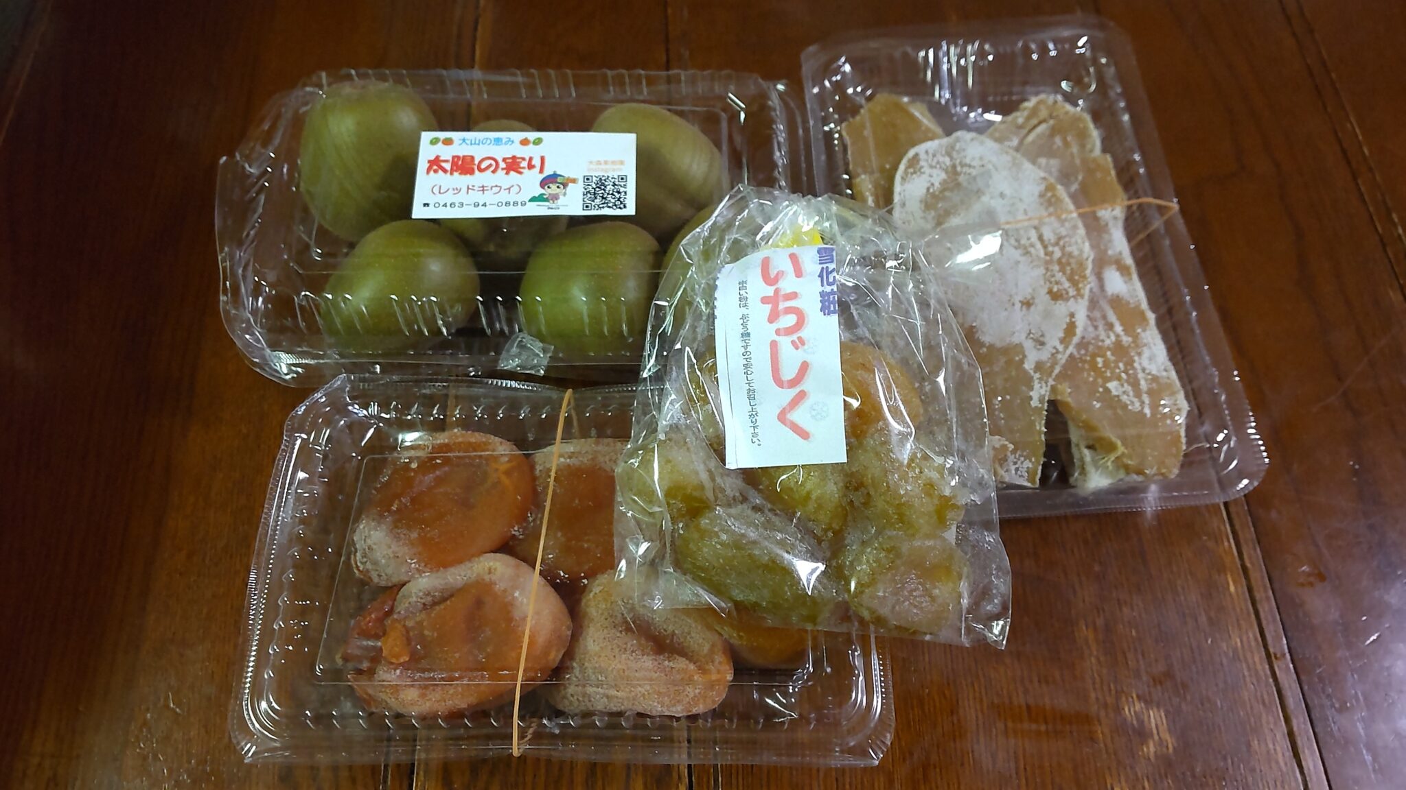 途中の踊り場で、地元の農家の方が直売をやっていました。自家製の干し柿、干し芋、いちじくのシロップ煮(試食を一口食べて即買い)、レッドキウイを購入。